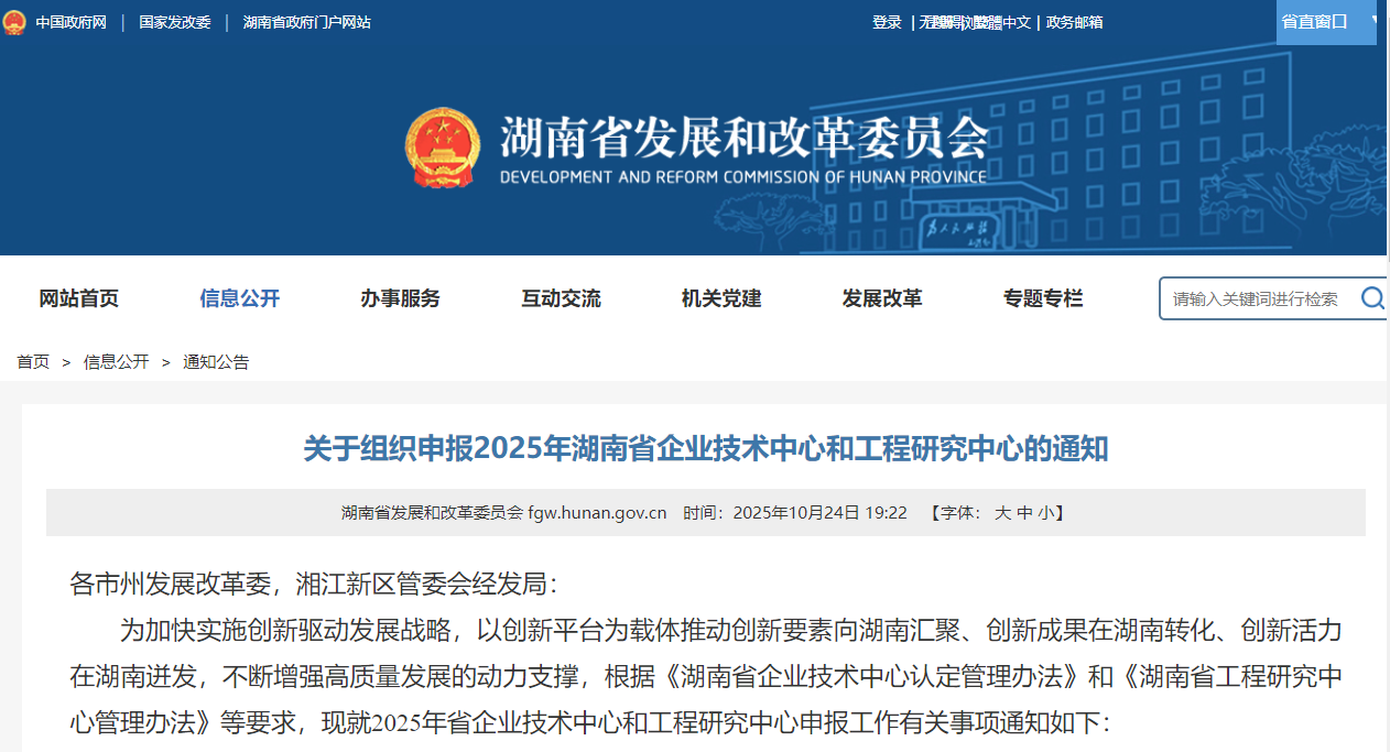 为加快实施创新驱动发展战略,以创新平台为载体推动创新要素向湖南汇聚、创新成果在湖南转化、创新活力在湖南迸发,不断增强高质量发展的动力支撑,根据《湖南省企业技术中心认定管理办法》和《湖南省工程研究中心管理办法》等要求,现就2025年省企业技术中心和工程研究中心申报工作有关事项通知如下: