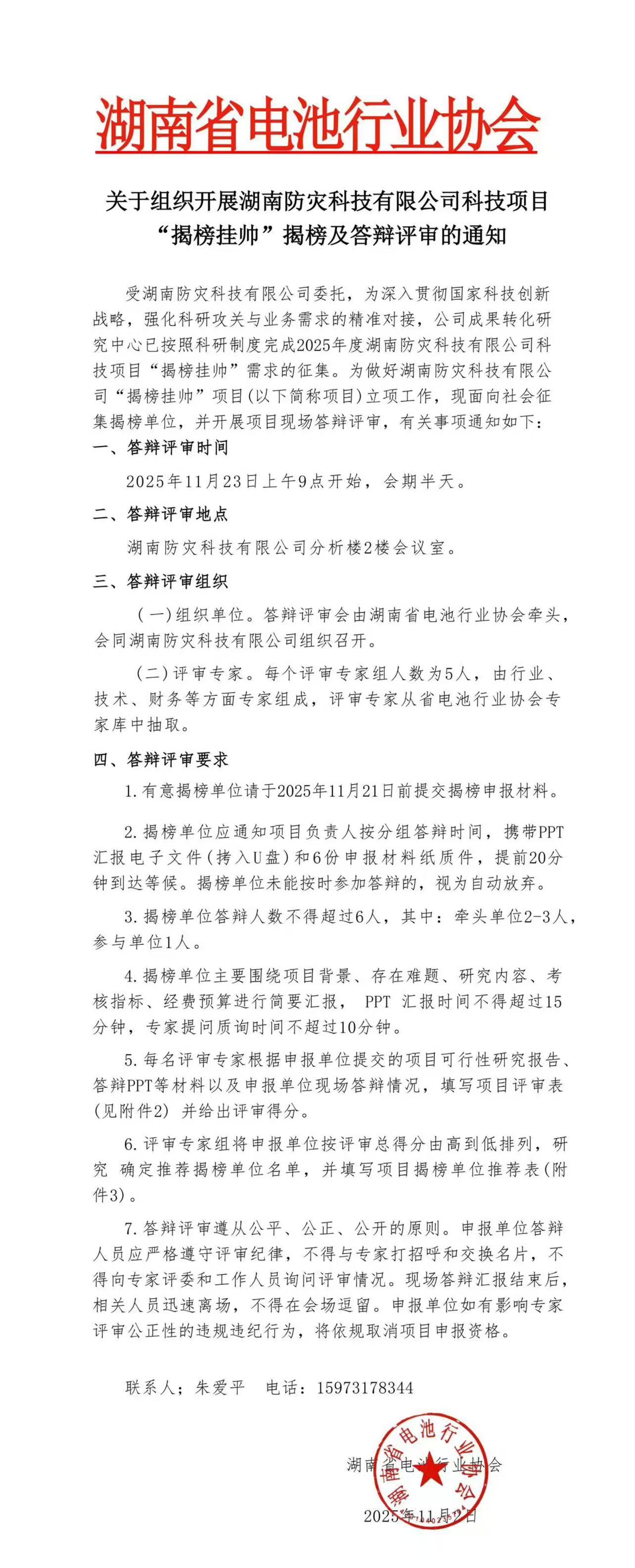 受湖南防灾科技有限公司委托,为深入贯彻国家科技创新战略,强化科研攻关与业务需求的精准对接,公司成果转化研究中心已按照科研制度完成2025年度湖南防灾科技有限公司科技项目“揭榜挂帅”需求的征集。为做好湖南防灾科技有限公司“揭榜挂帅”项目(以下简称项目)立项工作,现面向社会征集揭榜单位,并开展项目现场答辩评审,有关事项通知如下:
