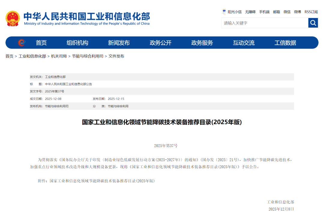 12月8日,工业和信息化部发布《国家工业和信息化领域节能降碳技术装备推荐目录(2025年版)》。