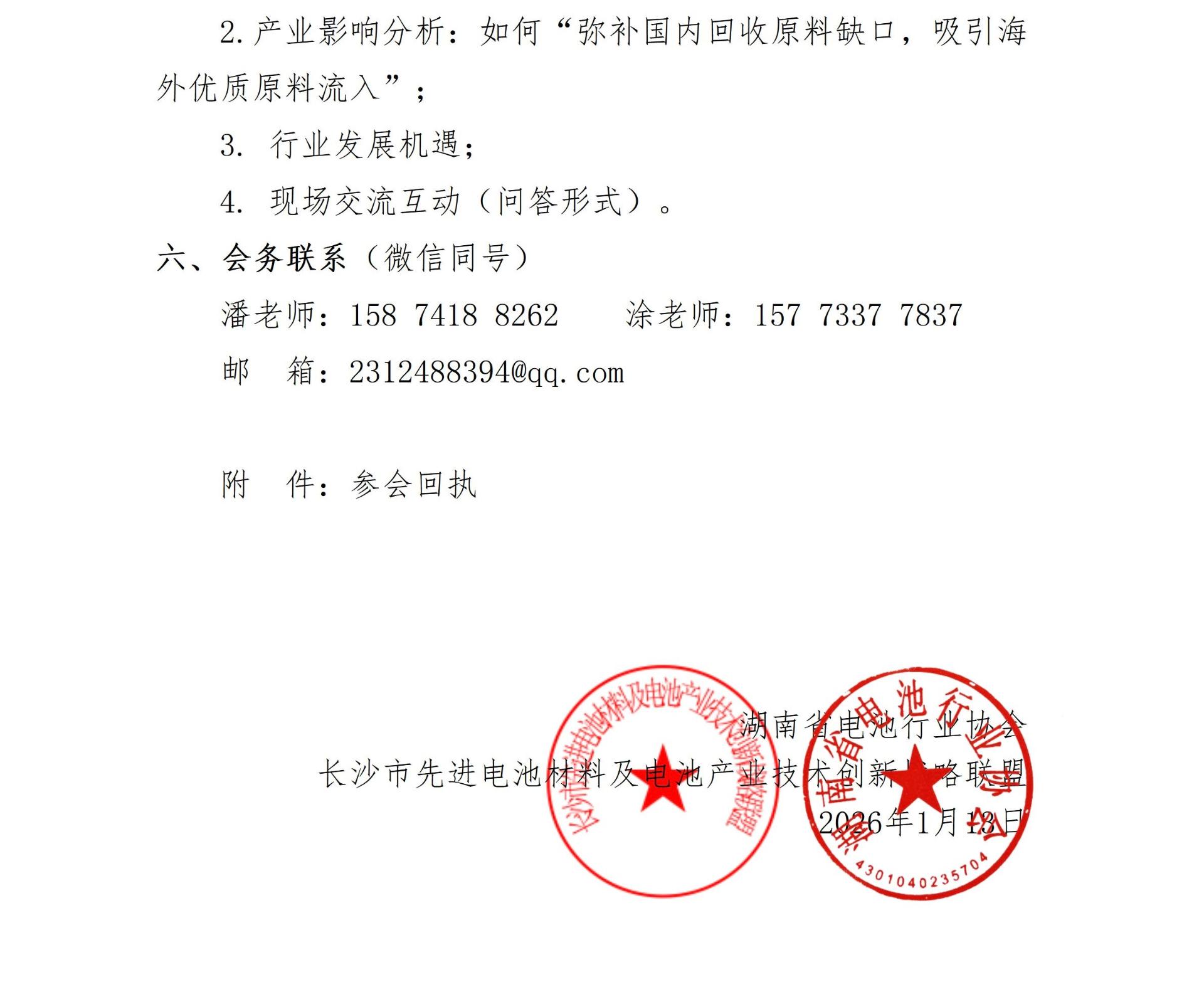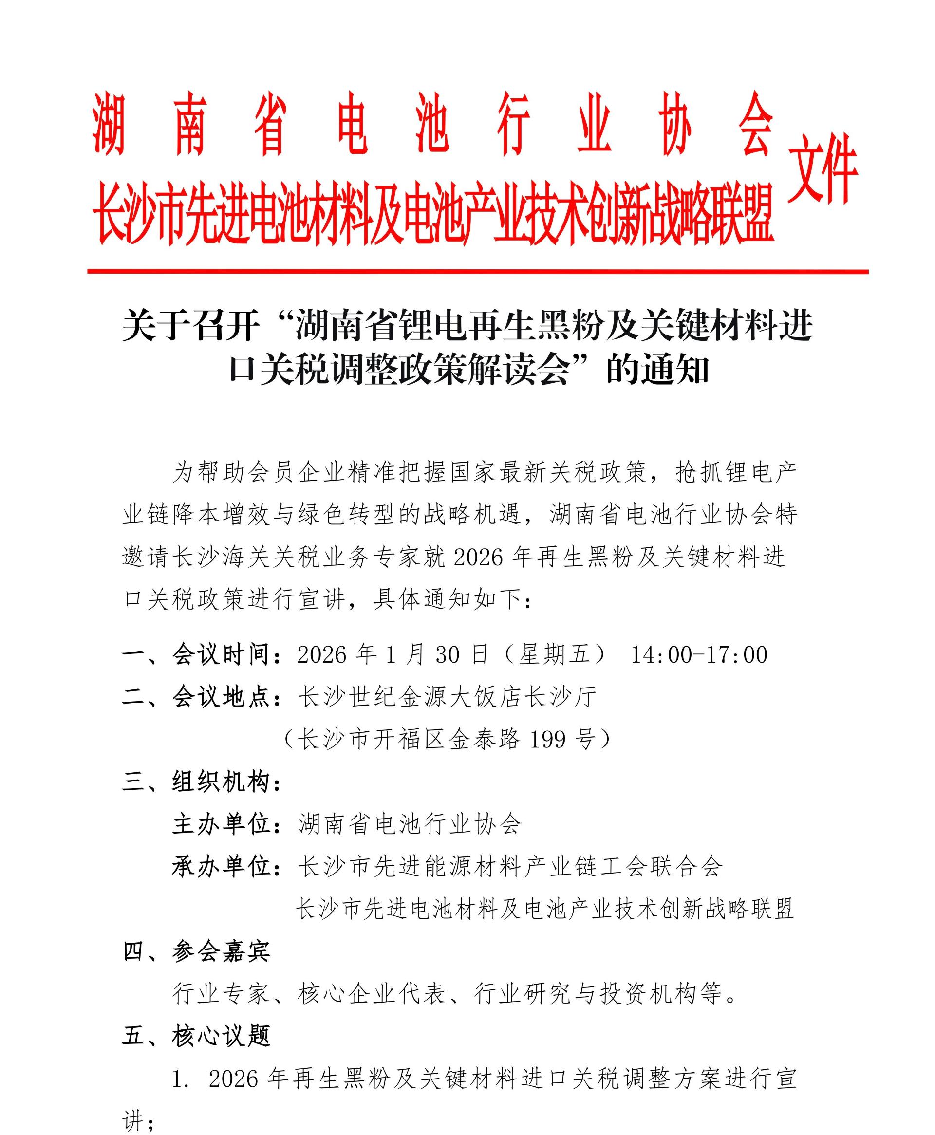 为帮助会员企业精准把握国家最新关税政策,抢抓锂电产业链降本增效与绿色转型的战略机遇,湖南省电池行业协会特邀请长沙海关关税业务专家于1月30日召开“2026湖南省锂电再生黑粉及关键材料进口关税政策解读会”,欢迎莅临交流。具体通知如下: