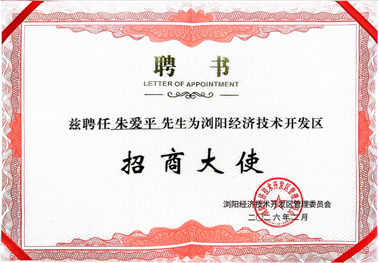 在本次会议重点环节,湖南省电池行业协会秘书长朱爱平依托在行业领域的多年积累与广泛影响力,结合持续为浏阳经开区产业升级、项目落地提供的专业支撑与服务,正式受聘为“浏阳经济技术开发区招商大使”。与会相关领导现场为朱爱平在内的11位招商大使颁发聘书,以聘任凝聚行业智慧,赋能园区招商引资与产业高质量发展。