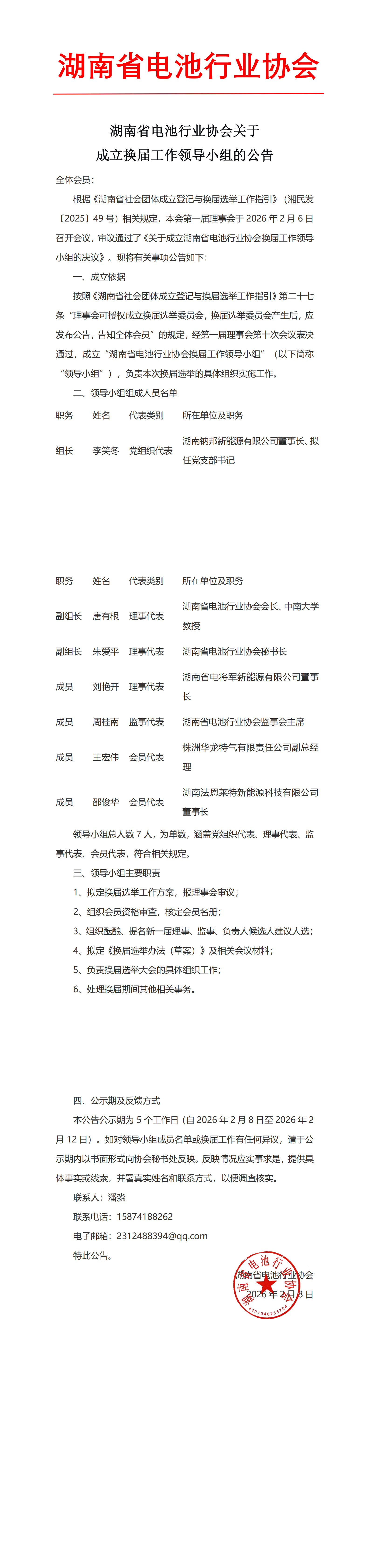 湖南省电池行业协会关于成立换届工作领导小组的公告