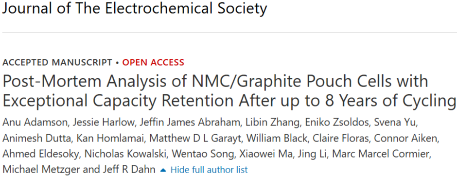 近日,达尔豪斯大学J. R. Dahn教授团队在《Journal of The Electrochemical Society》发表重磅研究成果。该研究对多款NMC/石墨软包电池进行了长达8年的连续循环测试与拆解分析。凭借这一超越行业常规的超长周期观测数据,研究团队深入揭示了决定锂离子电池终极寿命的关键因素,其结论不仅挑战了部分传统认知,更为电动汽车长寿命化及车网互联(V2G)应用提供了坚实的理论支撑,引发了学术界与产业界的广泛关注。